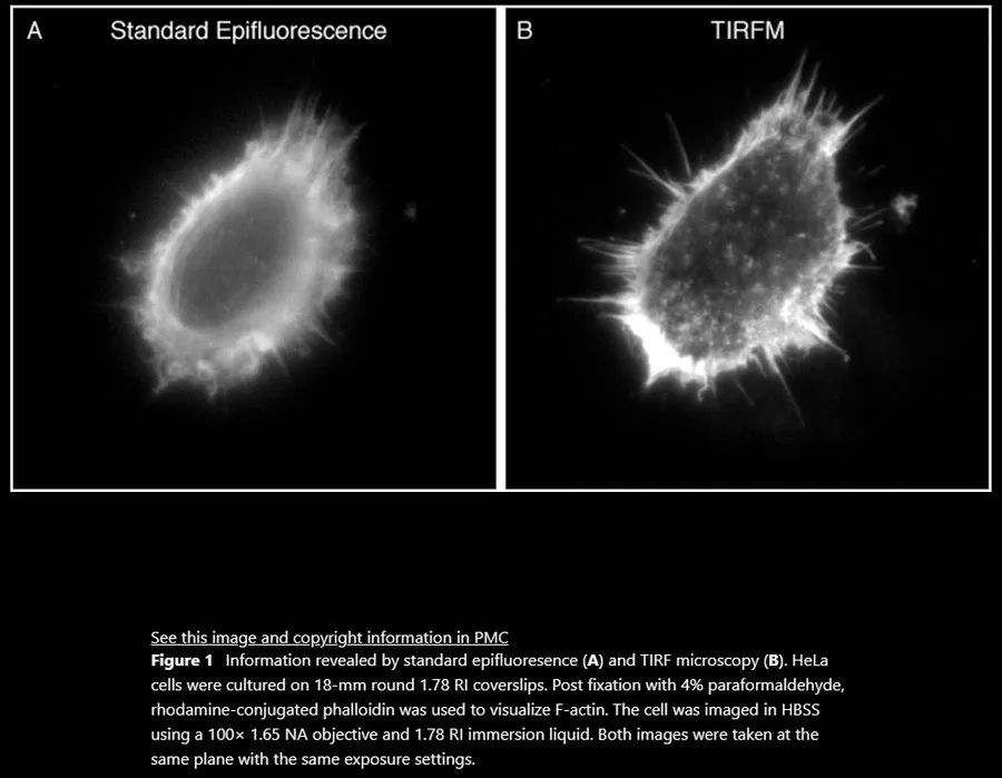 ① Fish KN. Total Internal Reflection Fluorescence (TIRF) Microscopy. Curr Protoc. 2022 Aug;2(8):e517. doi: 10.1002/cpz1.517. PMID: 35972209; PMCID: PMC9522316.